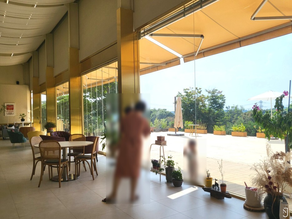 카페 통유리 창문을 통해서 보이는 숲속 뷰의 모습,